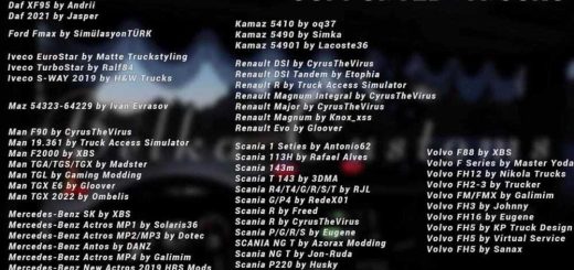 | Êtes-vous intéressé par les Euro Truck Simulator 2 mods? Notre base de données de ETS2 mods est pleine de mods gratuits. Comment les ETS2 mods rendent le jeu plus intéressant? Les ETS2 mods sont un fichier gratuit pour le jeu Euro Truck qui ajoute à un jeu plus d'objets ou d'objets tels que des camions, des voitures, des bus ou même de nouvelles cartes. Donc, si vous vous ennuyez de jouer à un jeu de base, essayez simplement les Euro Truck Simulator 2 mods. Si vous voulez essayer n'importe quel mod pour votre jeu, choisissez simplement la catégorie Euro Truck Simulator 2 mods et téléchargez les mods sur votre PC. De plus, si vous recherchez un ETS2 mod très spécifique, nous avons créé des catégories pour tous les types de mods. C'est pourquoi il est si facile de trouver n'importe quel mod pour le jeu Euro Truck Simulator 2. Notre communauté crée et les fichiers Euro Truck Simulator 2 mods gratuitement. Alors s'il vous plaît, soyez reconnaissant aux auteurs de mods qui font un travail énorme pour le créer. |