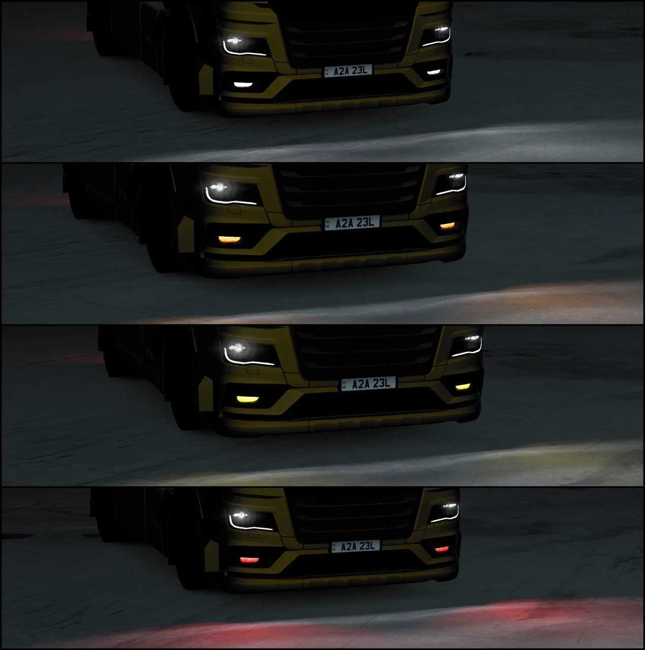 Ce mod ajoute de nouveaux blocs optiques « LED » avec feux antibrouillard fonctionnels blancs, orange, jaunes et rouges pour le MAN TGX 2020 de base.