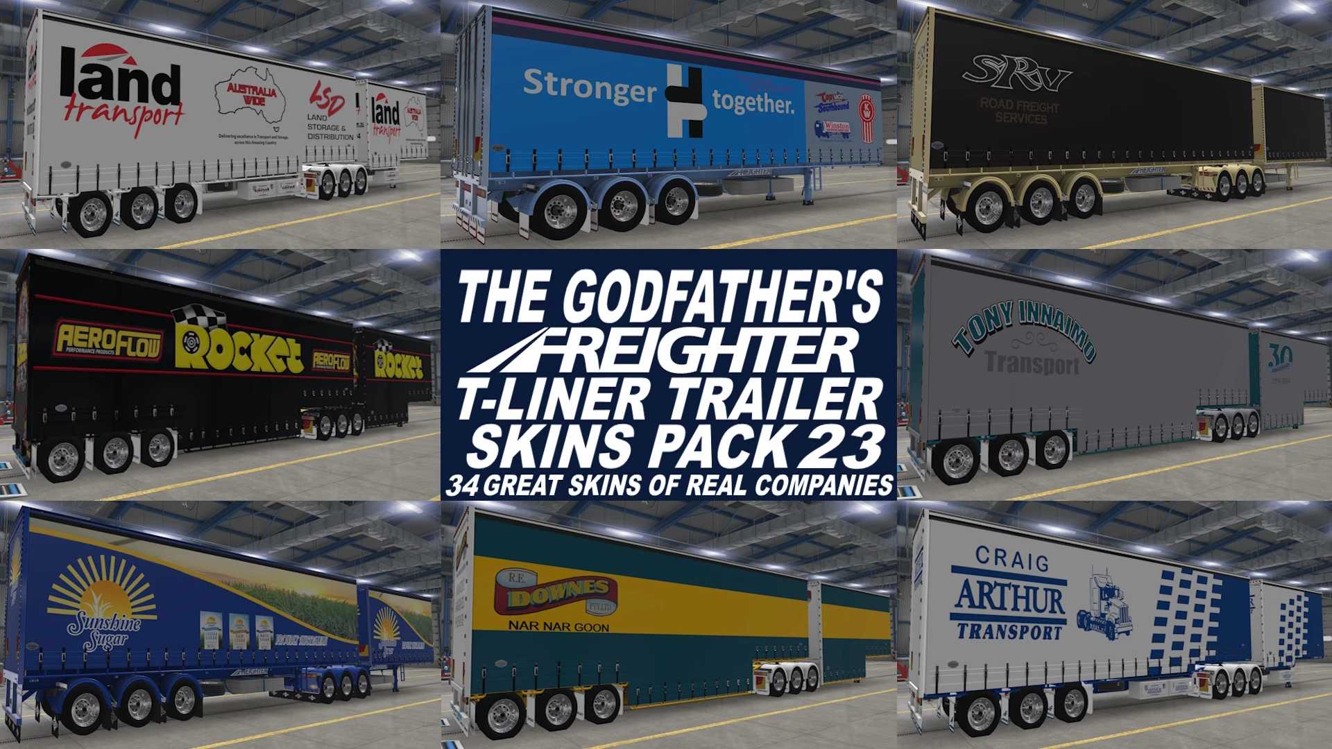 D'autres packs de skins de remorque T-Liner du Godfather's Freighter peuvent être téléchargés sur les sites ATS Mod qui proposent des mods de la société The Godfather's Mods pour ATS et sont 100 % gratuits à télécharger.