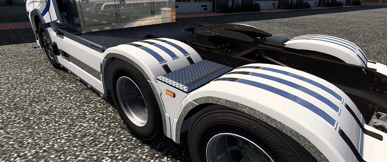 Châssis FH3 à 2 essieux, échappement gauche et droit, avec deux barres latérales Ranger et Elegance (versions couleur et mate également disponibles). Les échappements FH3 (gauche et droit) sont ajoutés à deux barres latérales Ranger et Elegance avec versions ajourées (versions couleur et mate également disponibles).