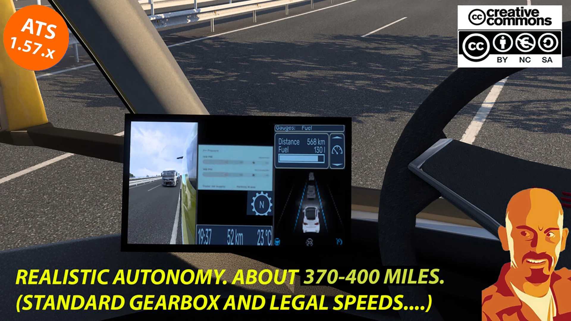 Ce mod permet de recharger le camion Tesla Semi 2019 dans les stations-service classiques et ajuste son autonomie réelle à environ 370-400 miles dans des conditions normales, c'est-à-dire : vitesses légales, boîte de vitesses standard ET CONDUITE FLUIDE !